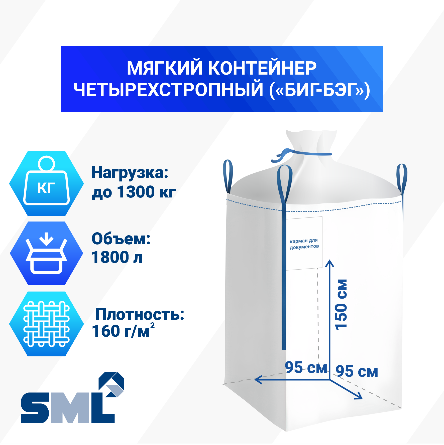 Мягкий контейнер разовый (Биг-Бэг) — упаковочная тара из прочного полипропиленового волокна. Компания «Полимакс» предлагает изделия различной конструкции (верх открытый или со сборкой, низ глухой или труба), 2- и 4-стропные грузоподъемностью до 2000 кг. Каждый мешок снабжен п/э карманом для хранения документации формата А4.