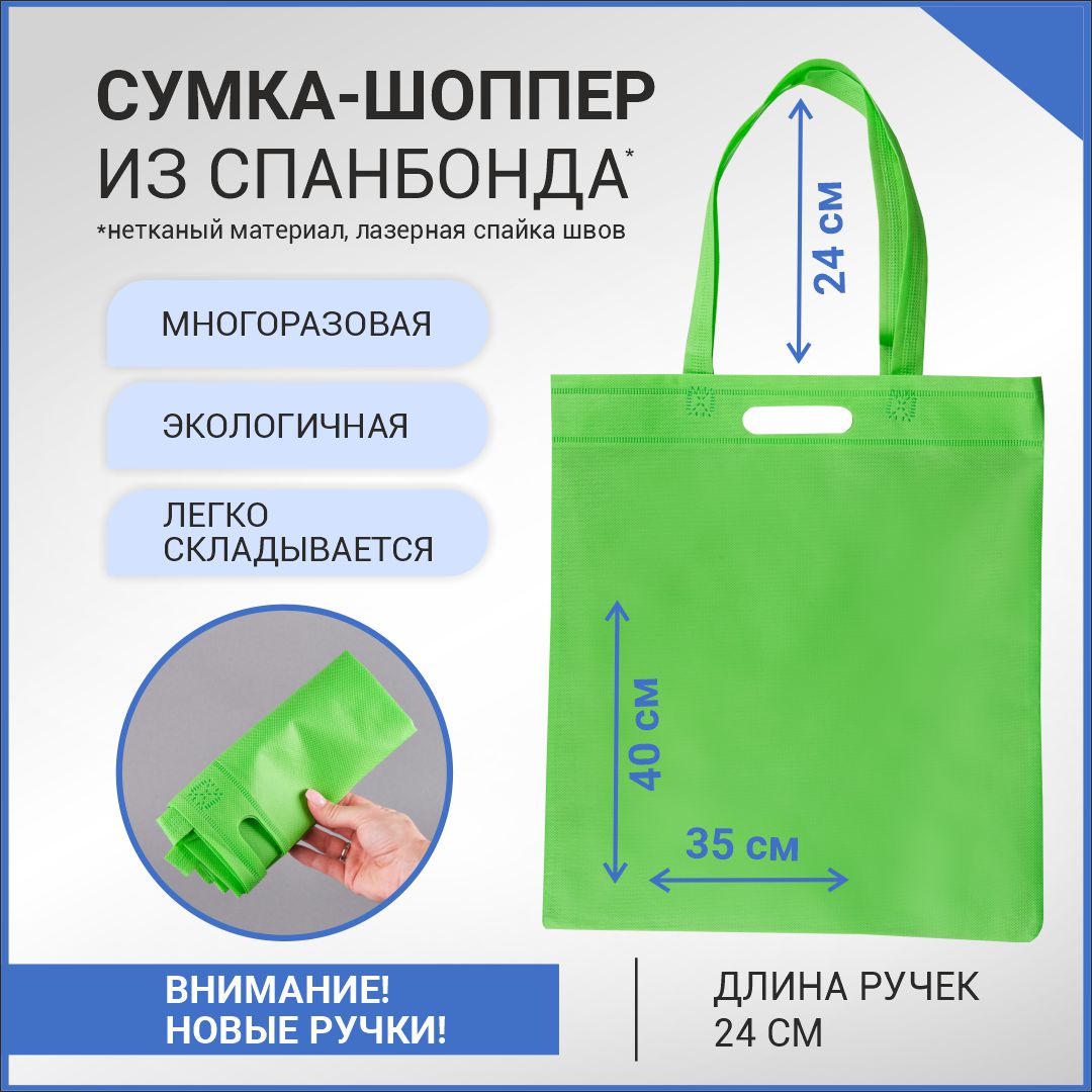 Сумка-шоппер из спанбонда с пришивными ручками 24 см, зеленая, 35 х 40 см