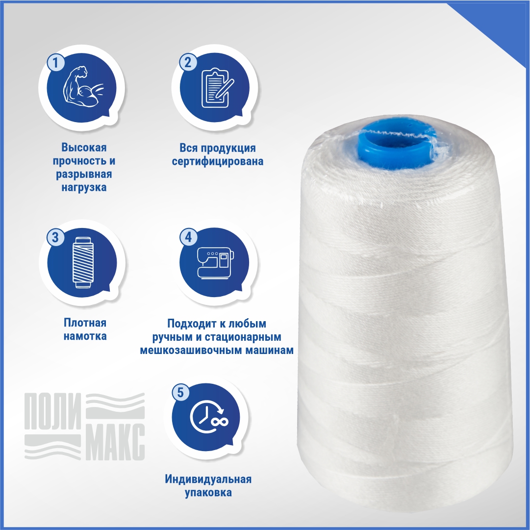 В компании «Полимакс» представлены белые мешкозашивочные нити из 100% полиэстера с силиконовой пропиткой. Ими фиксируют горловины мешков для защиты содержимого от влаги, мусора, просыпания во время транспортировки.