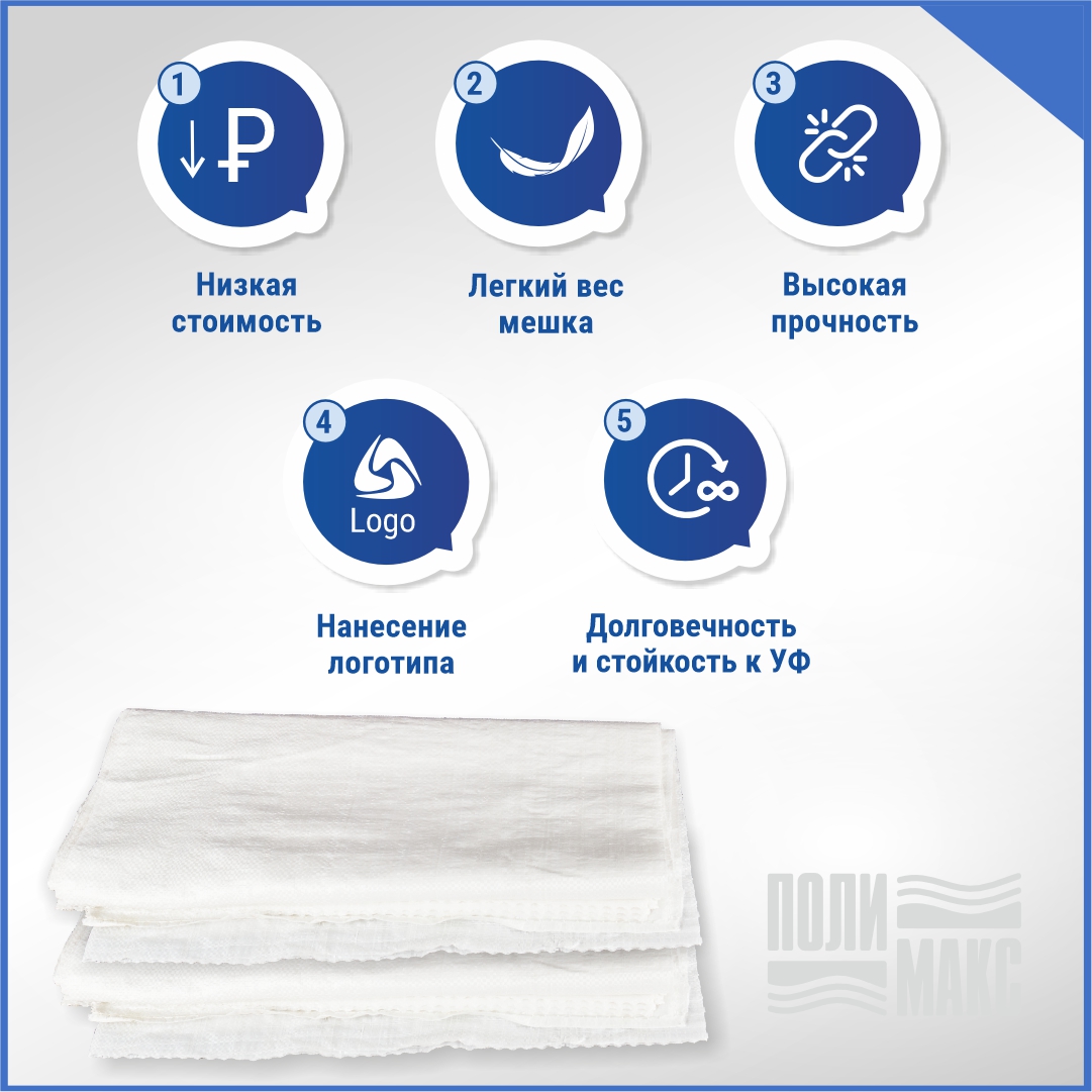 Компания «Полимакс» предлагает белые мешки из первичного полипропилена размером 50×90 см и вместимостью до 40 кг. Плотное плетение обеспечит сохранность содержимого. Ткань воздухопроницаема, поэтому пищевая продукция сохраняет свое качество. Посторонний запах отсутствует.